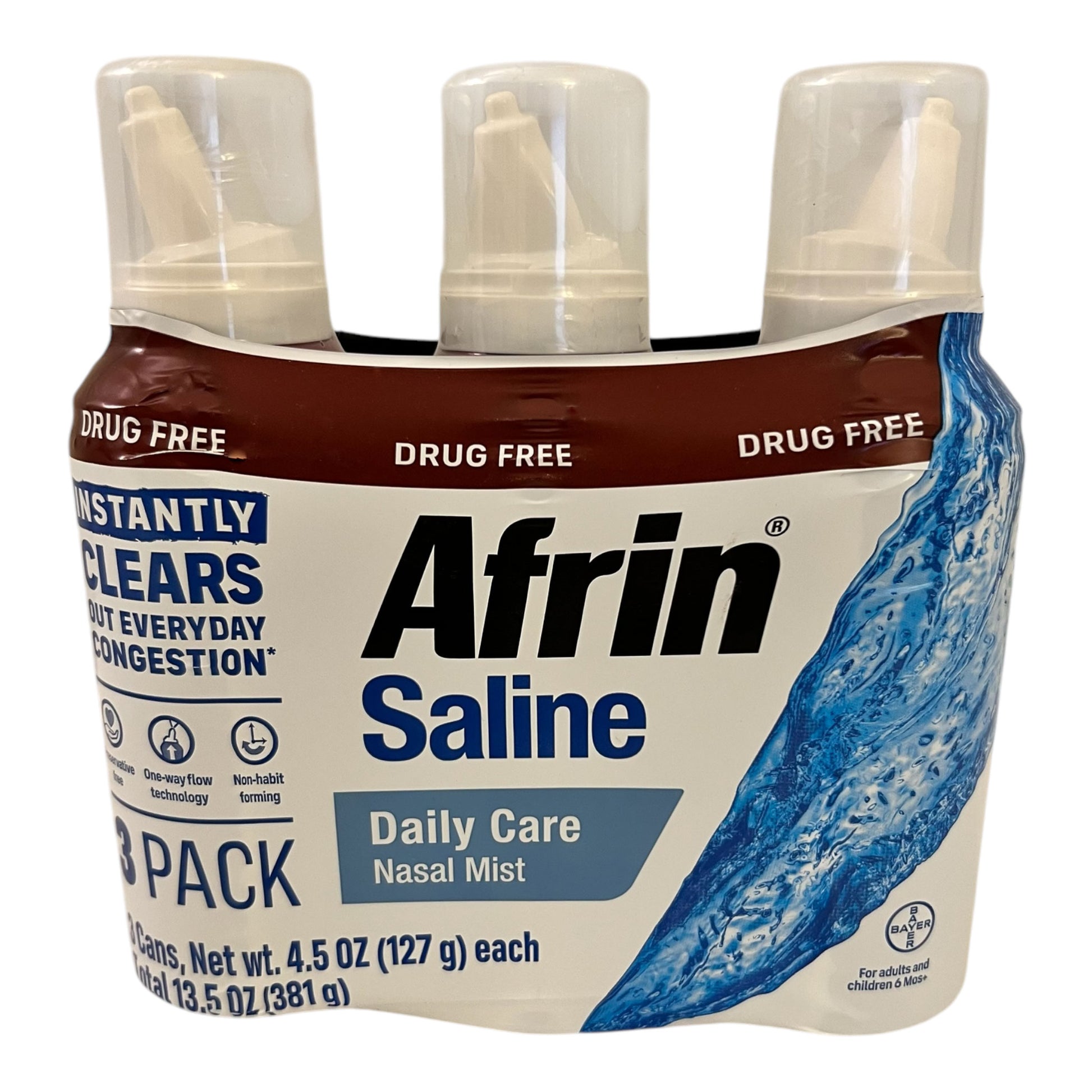 Breathe easier with Afrin Saline Daily Care Nasal Mist, a drug-free, non-habit-forming solution designed to instantly clear nasal congestion, excess mucus, and allergens. This isotonic purified saline mist gently flushes out nasal passages, making it ideal for daily use by adults and children (6 months and older). The one-way flow technology ensures that contaminants don’t flow back into the bottle, keeping the solution pure and safe.