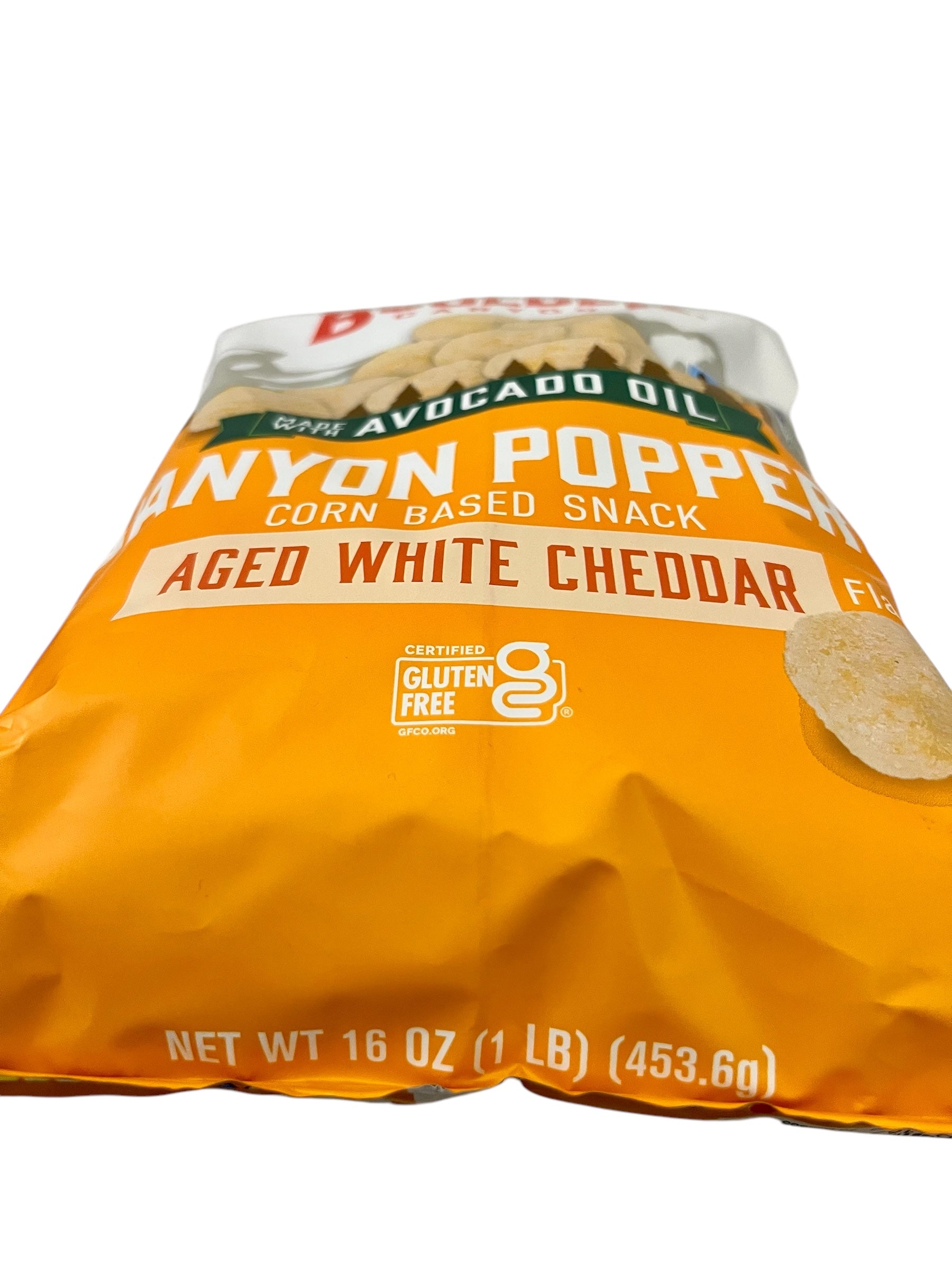 Boulder Canyon Aged White Cheddar Canyon Poppers are a gluten-free, corn-based snack cooked in 100% avocado oil for a smooth, buttery taste and satisfying crunch. Each popper is air-popped from corn meal and then seasoned with real aged white cheddar, delivering a bold, cheesy flavor in every bite.