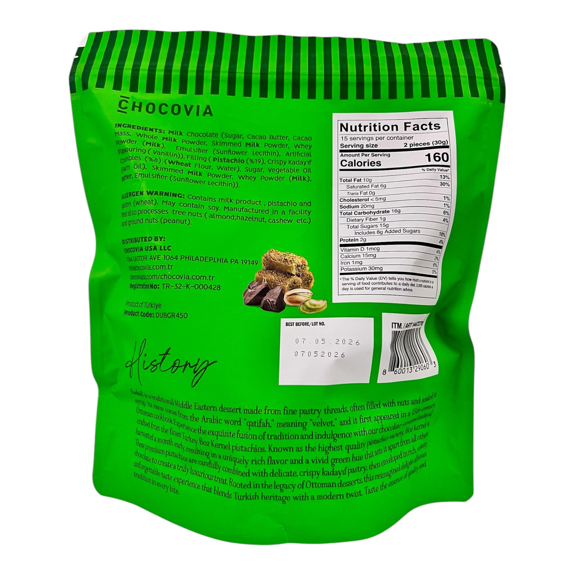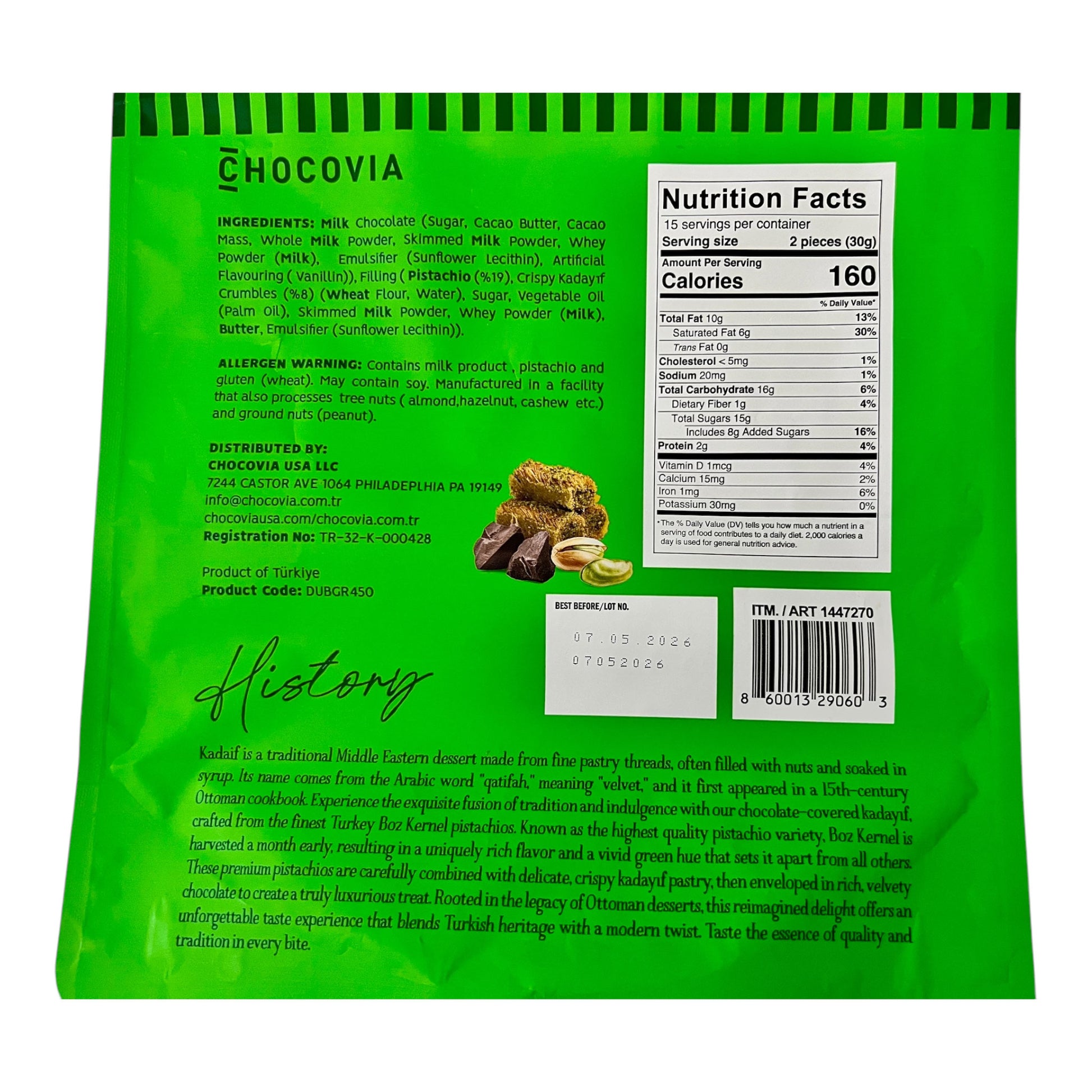 Indulge in the luxurious taste of Dubai Chocolate with Chocovia Dubai Style Milk Chocolate with Pistachio & Kadaif. This exquisite Middle Eastern-inspired treat blends rich, creamy milk chocolate with the crunch of premium pistachios and delicate kadaif pastry, creating a perfect harmony of flavors and textures. Each bag contains 30 individually wrapped chocolates, making it ideal for gifting, sharing, or enjoying as a personal indulgence.