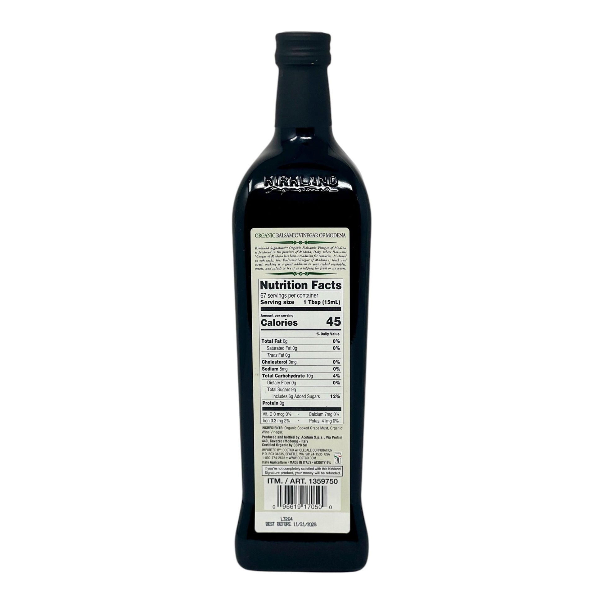 Elevate your dishes with the rich, smooth flavor of Kirkland Signature Organic Balsamic Vinegar of Modena. Produced in Modena, Italy, this premium-quality vinegar is crafted using organic cooked grape must and organic wine vinegar, with a balanced 6% acidity level that adds bold, authentic flavor to your favorite recipes.